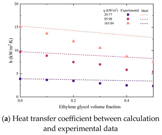 It could be seen that as the volume fraction of EG increased, the deviation between experimental data and calculated data gradually increased. In addition, this deviation continues to enlarge with the growth of heat flux. The reason for this phenomenon is that although the ideal equation considers the influence of component proportion on the mixture, it ignores the interaction between components caused by concentration differences. Unlike pure working fluids, only the volatile component (DW) in non-azeotropic mixtures evaporates and produces bubbles during boiling. The concentration of the liquid phase at the vapor–liquid interface changes constantly, which not only affects mass transfer resistance but also saturation temperature. In addition, the interaction between components will be amplified when the concentration of non-volatile components (EG) increases or the heat flux density increases.