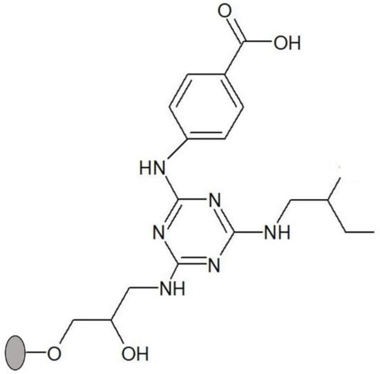 Preparation of dichlorotriazinyl agarose was performed as described in [23]. Aminated Sepharose CL-6B was suspended in a solution of acetone/water 50% (v/v)—1 mL per gram of gel. The slurry was maintained at 0 °C in an ice bath on a shaker. An amount corresponding to 5 molar equivalents of cyanuric chloride, relative to the extent of amination (≈20 μmol amine groups/g gel), was dissolved in 8.6 mL of acetone per gram of cyanuric chloride and divided into four aliquots. Each aliquot was added to the aminated gel at intervals of about 30 min, maintaining the mixture at 0 °C with constant shaking. The pH was monitored with the aid of pH-indicator strips and maintained neutral by addition of a NaOH 1 M solution. The gel was then washed with 2 × 10 gel volumes of each acetone/distilled water mixture (v/v)—1:1, 1:3, 0:1, 1:1, 3:1, 1:0—and then with abundant water to remove unreacted cyanuric chloride. The cyanuric chloride activated gel (dichlorotriazinyl agarose) was immediately used for the substitution of the two remaining chlorine atoms, designated as R1 and R2.
