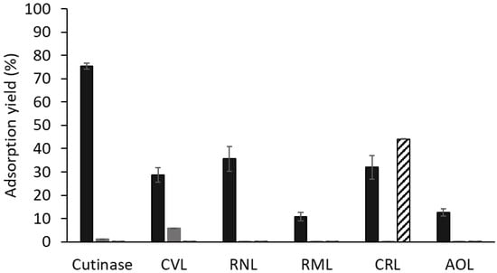The high ηprot (100%) and ηact (75%) obtained for cutinase are in accordance with the purity of the enzyme preparation used and the results reported by Sousa et al. [17,18]. The ηact (14.7%) for the lipase from C. viscosum was almost half of the protein adsorption yield (29%) obtained with this lipase (Table 2). This fact may be explained by two reasons: (i) proteins/peptides of low molecular weight present in the CVL preparation (see Figure S1), resulting from unspecific proteolysis during the purification and/or storage of CVL [43] are adsorbed but are likely inactive, thus increasing the value of protein adsorption yield (obtained by measurement of absorption at 280 nm); (ii) and/or the process of loading and washing affects lipase activity, thus reducing the value of ηact. Oppositely, in the case of lipase from C. rugosa, the ηact (70.9%) was more than two times higher (Table 2) than the protein adsorption yield (36%). According to the SDS-PAGE densitometry analysis of the breakthrough fractions collected during the CRL adsorption assay, it was found that approximately 30% of CRL did not bind to the ligand. This finding is consistent with the approximate ηact value of 70% obtained for this specific lipase.