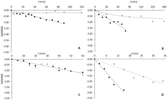 Deactivation of free enzymes (black circles) and enzymes adsorbed to ligand 3′/11 (grey triangles) at 60 °C and pH 8.0. Enzymes and protein concentration by graph: (A) cutinase, the protein concentration was 35 μg/mL in both cases; (B) CVL, the concentrations used were 52 μg/mL and 160 μg/mL solution for free and adsorbed enzymes, respectively; (C) CRL, the concentrations used were 3.5 mg/mL and 200 μg/mL solution for free and adsorbed enzymes, respectively; (D) RNL, the concentrations used were 8 mg/mL and 5 mg/mL solution for free and adsorbed enzymes, respectively.
