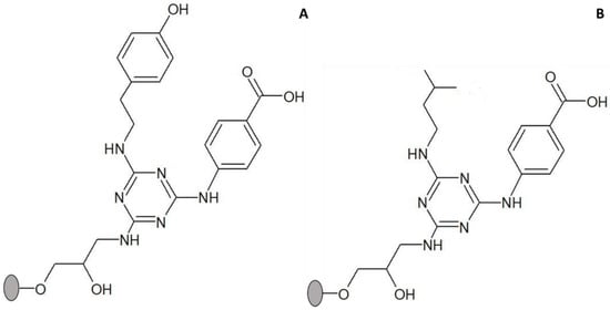 Enzyme adsorption to solid-phase synthesized ligands was performed by affinity chromatographic assays at room temperature as described in [18,19]. Sepharose CL-6B with bound ligand (0.5–0.75 mL) was packed into 4 mL columns and washed with 3 × 2 mL regeneration solution, 0.1 M NaOH in 30% (v/v) isopropanol, then with water to bring the pH to neutral and finally with equilibration buffer, 20 mM Tris-HCl, pH 8.0 or 20 mM acetate, pH 5.3 in the case of invertase. For each resin, 1–5 mL of enzyme solution with protein concentration between 0.5–1.5 mg/mL, depending on the purity of the sample containing each enzyme—in 20 mM Tris-HCl, pH 8.0—was loaded onto the column. Washing with equilibration buffer was performed, and 1 mL fractions were collected until the absorbance at 280 nm became lower than 0.005. Finally, the columns were washed with regeneration solution, followed by distilled water, and stored between 0 and 4 °C in 20% (v/v) ethanol. Adsorption yields (ηprot and ηact) were calculated based on the percentage of total protein adsorbed (measured by absorbance at 280 nm) and on the percentage of activity adsorbed according to the following equations (Equations (1) and (2)):