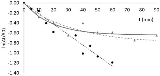 Deactivations observed were not always first-order processes. Therefore, activity decays were fitted either to a simple first-order kinetic model (exponential decay) or to four-parameter biexponential models [27,28] (see Supplementary Materials) using the method of least squares and the Solver tool of Microsoft® Excel® 2016. Fitting to these models was made to provide a phenomenological description of the data as well as to guide the eye on the graphic representation of the inactivation curves. However, mechanistic elucidation was not possible with the available data, and considerably different deactivation mechanisms can have the same formalism (Supplementary Materials). Nevertheless, simplifications of this type are of interest when little is known about the inactivation mechanisms, such as in the present work, to compare enzyme deactivation under similar conditions [29].