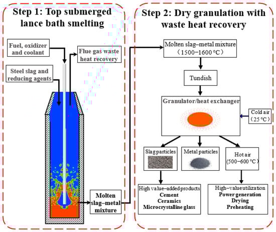 Figure 1 depicts a two-step steel slag treatment process developed by the present authors, which combines top submerged lance (TSL) bath smelting (first step) with dry and centrifugal granulation of molten slag–metal mixture with waste heat recovery (second step). In this process, solid or molten steel slag and a reducing agent are first charged into a TSL furnace, in which smelting reduction of the steel slag occurs, resulting in a molten slag–metal mixture. In the second step, the molten slag–metal mixture is fed into a centrifugal granulator that ultimately produces solid slag particles and solid metal particles, as well as hot air. While recovering valuable metal elements, the produced slag particles can be used for the production of high-value-added products such as cement, ceramics, microcrystalline glass, etc. Additionally, the obtained hot air can be used for, for instance, power generation and preheating or drying materials. Therefore, the technology illustrated in Figure 1 provides a fresh perspective and a new pathway for efficient and effective recycling and environmentally friendly treatment of steel slag and other metallurgical solid wastes, resulting in zero solid waste emissions.