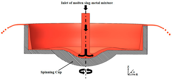 - The center axis of the spinning cup precisely coincides with that of the cylindrical pouring stream of the molten slag–metal mixture.