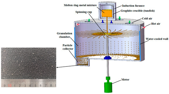 High-temperature experiments on centrifugal granulation of molten slag–metal mixtures using a spinning cup were carried out in this work on an experimental set-up schematically shown in Figure 5. A high-frequency induction furnace (not shown in Figure 5) was used to heat blast furnace slag mixed with different proportions of metallic iron powders to 1600–1750 °C, leaving it in a liquid state to form a molten slag–metal mixture. The melt mixture was then poured into a graphite crucible heated by another high-frequency induction furnace, which was used as a holding tundish. An opening hole at the bottom center of the tundish allowed the molten slag–metal mixture to flow into the spinning cup underneath, which broke the liquid into droplets. The droplets were then cooled to become solid particles by blowing in cold air. Directly below the tundish was the granulation chamber, in which a motor-driven spinning cup was installed to achieve centrifugal granulation of the molten slag–metal mixture. In addition, the sidewall of the granulation chamber was water-cooled to avoid the melt droplets adhering to the sidewall during their in-flight to hit the wall. The cooled and solidified slag and metal particles were finally collected in a particle collector bin below the granulation chamber.