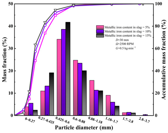 Figure 6 shows the particle size distribution of slag particles in terms of mass fraction and accumulative mass fraction obtained from the high-temperature centrifugal granulation experiments. It can be seen from this figure that when the liquid feeding rate is 0.5 kg·min−1, and the cup spinning speed is 2500 RPM, the measured diameter of the slag particles mainly falls in the range between 0.27 mm and 2.8 mm, and nearly 98% of slag particles have a diameter smaller than 0.88 mm. These slag particles are fine enough for efficient heat exchange with air and also possess enough high glass content (>90%) for use in making cement. Also, from the relationship between the Sauter mean diameter (SMD) of the experimentally granulated slag particles and the metallic iron content in the slag, as can be seen from the figure, the SMD decreases gradually with the increase in the metallic iron content. For the liquid feeding rate of 0.5 kg·min−1 and the cup spinning speed of 2500 RPM, when the metal iron content increases from 5% to 15%, the SMD of the slag particles decreases by 13.77%, indicating that the participation of the metal in the slag promoted the breakup of the slag to a certain extent.