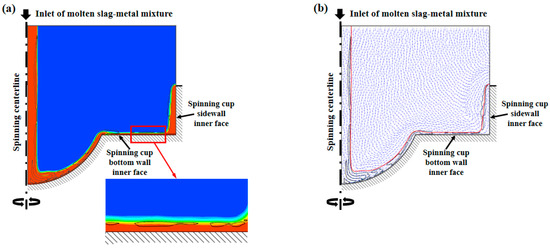 Behavior of molten slag flow on the inner face of the spinning cup simulated by the two-dimensional CFD model: (a) volume fraction contour plot, (b) velocity vector field (liquid feeding rate = 0.5 kg·min−1, cup spinning speed = 2500 RPM, cup sidewall height = 5 mm, and metallic iron content in slag = 10%).