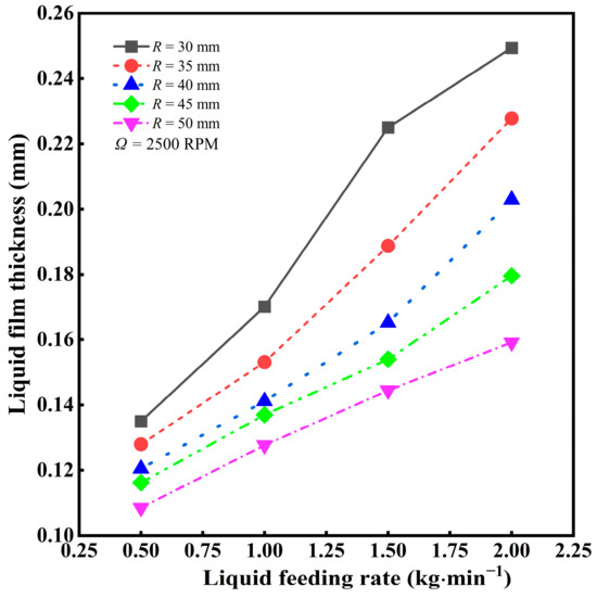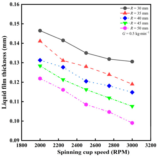 - The liquid film thickness at the spinning cup edge increases with the increase in liquid feeding rate but decreases with the increase in cup spinning speed. For the spinning cup with a diameter of 30 mm, the liquid film thickness decreases by 10.88% when the cup spinning speed is increased from 2000 RPM to 3000 RPM. For every 1 kg·min−1 increase in the liquid feeding rate, the liquid film thickness increases by about 28.15%. When the spinning cup diameter is increased from 30 mm to 50 mm, the liquid film thickness can be reduced by 19.26%.