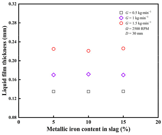 As shown in Figure 13, assuming that the liquid feeding rate and the cup spinning speed remain constant, a variation in the metallic iron content in slag almost has no influence on the liquid film thickness at the spinning cup’s edge. Changes in the metal content of slag mainly affect the physical properties of the slag. However, these changes in physical properties have little effect on the formation and thickness of the liquid film during centrifugal granulation in a spinning cup. Meanwhile, the liquid film thickness is mainly determined by the centrifugal force and the liquid feeding rate, which are kept constant under this condition. Nevertheless, since the liquid film thickness at the cup edge affects the slag particle size, the effect of liquid film thickness on the granulation effect of the molten slag–metal mixture needs to be further investigated. A quantitative relationship between the liquid film thickness at the edge of the spinning cup predicted by the CFD model and the arithmetic mean diameter of the slag particles measured by high-temperature centrifugal experiments is established based on experimental and simulation results, as given in Table 4. The data in this table indicate that, as the liquid film thickness increases, so does the diameter of the slag particles. The average ratio between the mean slag particle diameter and the liquid film thickness decreases with an increase in metallic iron content in the slag. For instance, in the metallic iron content range of 5–15%, this ratio is around 4.25 (±0.3), which is close to the value of 4.0 reported on centrifugal granulation of pure molten blast furnace slag [21]. In addition, the data in Table 4 further indicate that, as the metallic iron content in slag increases, the ratio between the mean slag particle diameter and the liquid film thickness decreases nearly linearly. As a result, if the desired granulation effect is required, this relationship may be utilized to forecast appropriate liquid film thickness and establish the relevant control parameters (e.g., liquid feeding rate, spinning cup size, and cup spinning speed) for achieving such liquid film thickness.