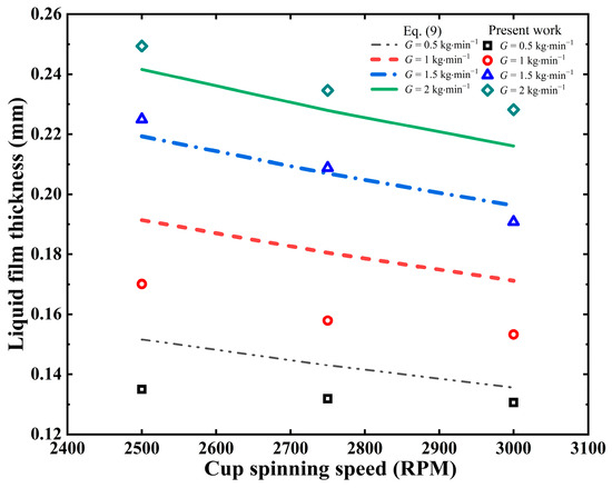 Comparison of the liquid film thickness predicted in this work with that calculated using Equation (9) (spinning cup diameter = 30 mm, cup sidewall height = 5 mm, metallic iron content in slag = 10%).