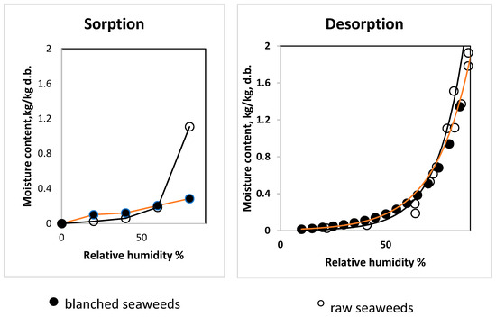 The raw and blanched seaweeds showed different behavior during the absorption of moisture. Figure 2 shows such behavior at 25 °C. The blanched seaweeds demonstrated a higher accumulation of water when compared with the raw seaweeds at low values (from 20.0 to 40.0% RH. But the trend was different at 60.0% relative humidity. An increase in relative humidity to 80% resulted in a change of moisture in raw seaweed at this temperature, and the blanched seaweed showed a linear trend in the range of RH 20~80%. It is interesting to note that the increase in the equilibrium moisture content of the dried blanched seaweeds was approximately 1% d.b. in the range between 20 and 40% RH. At the same time, raw seaweeds showed an increase in water content by two times in the same RH range. The temperature range 10.0~38.0 °C did not show an effect on the sorption characteristics of blanched seaweeds in the range between 20.0 and 80% RH (p > 0.05). At the same time, the sorption properties of raw seaweeds at 80% RH were significantly lower at the temperature of 10 °C when compared with 25.0 and 38.0 °C (p < 0.05), while at RH in the range between 20.0 and 60.0% the sorption of water was higher at 10.0 °C (p < 0.05). Similar behavior was observed for the red alga Gracilaria in the temperature range 5 to 40 °C [6] and brown seaweed Fucus vesiculosus in the temperature range from 5 to 65 °C [25]. One study determined the sorption behavior at 20.0 °C using powdered sugar kelp (age and harvesting season was not clarified) [19]. The increase in moisture content at higher relative humidity values in all above-mentioned studies showed the influence of carbohydrate compounds in the seaweeds (sugar dissolution). We cannot fully support this statement, considering that the authors referred to research devoted to fruits (mango, pineapple, grape, etc.). The sharp increase in the equilibrium moisture content of raw seaweed at 80% and the relatively low water absorption at a relative humidity below 60.0% may be due to the hygroscopic nature of salts, which occupy a significant share among other compounds. The salt concentration in raw seaweeds was determined at 14.4% d.b., while the blanched seaweeds were salt-free. The study of sorption–desorption of salt–protein mixtures showed the same trend of a sharp increase in moisture content at RHs higher than 75.0% [26].