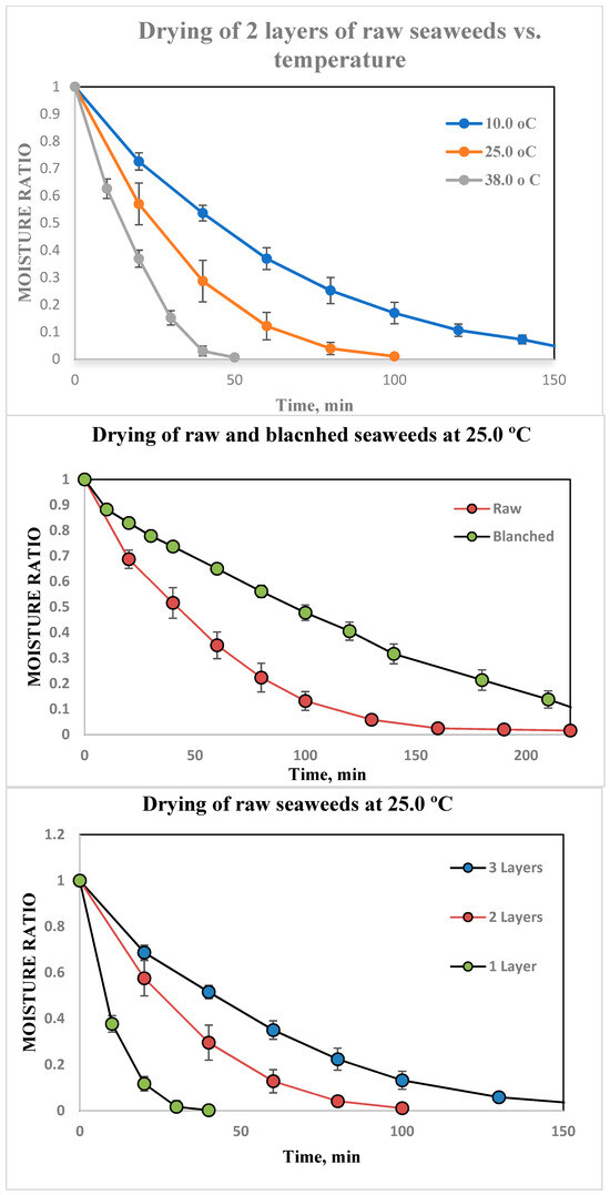 The kinetics are shown in Figure 3 at the temperature of 25.0 °C for different layers. Moisture removal of raw seaweed was much faster than blanched. This may be due to the higher moisture content and changes in structure. The increasing temperature accelerated the dewatering of seaweeds for both raw and blanched, and the highest dewatering rate was observed at 38 °C.