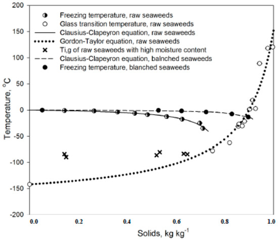 A typical state diagram represents the freezing and glass transition curves. The freezing curve represents the influence of the solid matter on the lowering freezing point. It was obtained from the data of the freezing point of samples with different moisture contents. The decreasing trend of the freezing point was modeled with the modified Clausius–Clapeyron equation for food [35], Equation (10):