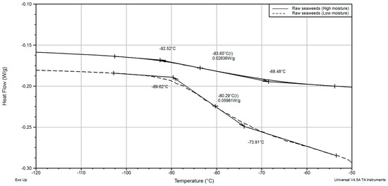 Table 1 represents information on the thermal transition of raw and blanched seaweeds with different moisture contents. Samples with moisture content below 25.0% did not show any crystallization phenomena in the temperature range −150.0~+100.0 °C. Glass transition was detected in a high-moisture raw seaweed sample (from 35.3 to 85.7% w.b.) in the temperature range −97.0~−73.8 °C. It was observed that the glass transition in those samples was very weak, as observed from the heat flow curve. The glass transition behaviors on the heat flow curve for low- and high-moisture seaweeds are shown in Figure 4. It can be seen that the glass transition step is extended over wide temperature range and it is not so clear for seaweeds with a high moisture content.