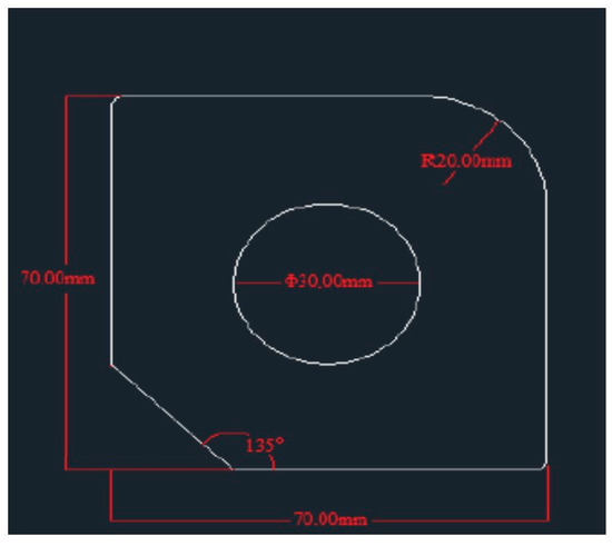 The selected material is a widely used carbon-and-steel alloy—EN10025 St37-2 plate (DIN17100). The investigated plate thickness was 10mm, which is characterized by a tensile strength (Rm transv.) of 340–470 N/mm2, and a fracture elongation (transv. min) of 24%. The chemical element upper limits by mass are as follows: C = 0.17% (max), Mn = 1.40% (max), P = 0.045% (max), and S = 0.045% (max). The dimensioning drawing specifics of a part are shown in Figure 1. The particular geometry and cutting paths were determined such as to examine synchronously the cutting quality of the specimen by permitting the laser cutting of two differently shaped workpiece corners: a round corner and a sharp corner. To complete the cutting process challenge, a disk was to be removed from the center of the test plate.