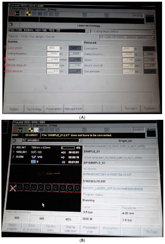 Inputting the laser process settings in the controller (A), and scheduling the total laser cutting process task for the nine-run orthogonal trials (B).