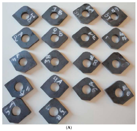 From a productivity perspective, the cutting time (CT) is a lean process characteristic that needs to be minimized. It is important because it directly affects unit cost and it determines the production capacity. The Trumpf TruLaser 5040 numerical controller allows programming of the machining task based on the inputs of the four controlling factors (Figure 3A). Therefore, the cutting time was measured in seconds, and it was recorded for the total batch of the scheduled workpieces (Figure 3B). The energy consumption (EC) is a lean-and-green process characteristic. It is a quantity that is sought to be minimized, and it is measured in kWh. It is a highly critical process characteristic because it significantly influences the unit product cost. The energy consumption was calculated from the power consumption of the laser cutting center and the cutting time; both are easily obtained. In the stand-by mode, the power for the laser cutting center was 23 kW. The laser power was preset according to the trial schedule of Table 2, and the relationship between the laser output as percentage of the maximum output and the power consumption of the machine and laser is available in the form of a graph [59]. The auxiliary gas consumption is also a process characteristic that was sought to be minimized, and it is also viewed as a lean-and-green indicator. It was calculated in a straightforward manner from the linear dependence of gas consumption (Nm3/h) on the applied gas pressure (bar), given that the slope of the line is regulated by the selected nozzle diameter. The calculation details may be found in ref. [59]. The recorded total gas consumption was converted in units of Nm3, after taking into account the duration for completing a processed specimen.