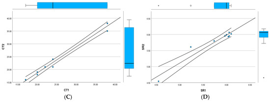 The data inspection commences by testing the visual location and dispersion traits of the overall trends of the four process/products characteristics using the QQ-plot and boxplot graphics (Figure 10). From Figure 10A,B (IBM SPSS v.29), it appears that the expected normal behavior for the observed data of the energy and gas consumption are matching fairly well; the boxplot for the gas consumption data may display some minor deviation from symmetry. On the other hand, the cutting time and the surface roughness datasets (Figure 10C,D) exhibit considerable departure from normality in both types of visuals. The boxplot for the cutting time depicts the location estimate strongly trending toward the lower readings; the QQ-plot seems to confirm that behavior. The QQ-plot for the surface roughness response reveals an abrupt shift that is identified to the lower (more sporadic) values of measurements. The boxplot for the surface roughness makes vivid the data asymmetry in connection to higher values that otherwise are marked by small variability.