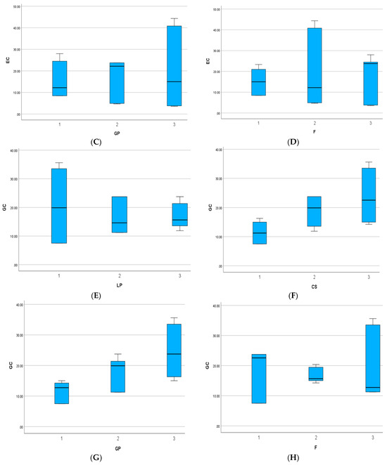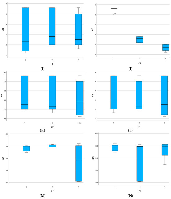 Boxplot factorial screening for the four factors: (i) laser power (LP), (ii) cutting speed (CS), (iii) gas pressure (GP), and (iv) focus length (F). Subplots for energy consumption (EC): (A–D); gas consumption (GC): (E–H); cutting time (CS): (I–L); surface roughness (SR): (M–P).