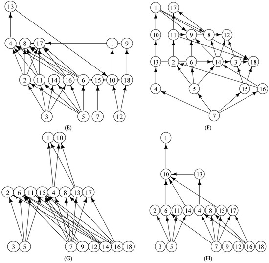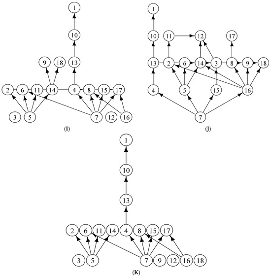 The former objective is achieved by tracking the respective Hasse diagrams, and the latter by plotting 2D Pareto Skylines. The direction of process/product improvement was guided by the minimization goals of the energy and gas consumptions, as well as the minimization of the cutting time, insofar as the surface roughness performance was maintained within a customary laser cutting range of 0.8–6.3 μm. In Figure 7, the Hasse diagrams for the preference ordering (‘Better-than-Graph’ [BTG] version) have been prepared so as to generate two-, three-, and four (full)-objective screening/optimization solution alternatives. All trial runs were input in the module data frame as single records. This tactic was preferred to having the duplicated response dataset split and reduced to central tendencies (means) and variability (signal-to-noise ratio) components, a Taguchi-method basic response-dataset treatment. This action would otherwise double the total number of objectives, and it would inflate the perplexity of the task for the implemented multi-objective solver. All 18 observations were fed into the BTG solver by just four separate response vectors. Thus, it was offered a chance to fine-tune its searching process. Additionally, it introduced a self-confirming step to pinpoint the optimal factorial-setting pattern. This was attained by exposing the paced sequence of the better-performing factorial combinations and their transitive associations between trial runs. The master (4-response) solution may be traced to the Hasse diagram in Figure 7K. It indicates that the optimal input parameters are linked to the first L9(34) OA trial run (trial #1). Automatically, the solution is confirmed by its duplicated trial outcome (trial #10). Therefore, the emerging final (profiled) adjustments were as follows: (1) the laser power to be set at 4 kW, (2) the cutting speed to be set at 0.8 mm/min, (3) the gas pressure to be set at 0.5 bar, and (4) the focus length to be set at −4 mm. Correspondingly, the achieved performances were as follows: (1) energy consumption of 8.44 kWh, (2) gas consumption of 7.50 Nm3, (3) cutting time of 38 s, and (4) surface roughness estimate at 5.732 μm. It must be remembered that this is a solution in which the correlated gas consumption characteristic was not removed from the screening/optimization scheme, i.e., all four characteristics were present in the BTG layout.