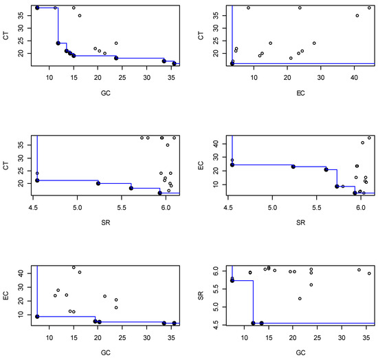 The Pareto frontier solution is a set of Pareto efficient solutions for multi-objective screening optimization [46,47,48,49,50,51,52,53,54,55]. In a generalized manner, the multi-objective optimization problem is cast to the form minimizeX R(X) = [R1(X), R2(X), …, Rc(X)]T according to conditions hi(X) ≤ 0, with i = 1, 2, …, s being the number of equality and inequality constraints. A point xij* is Pareto optimal or weakly Pareto optimal if there does not exist another point xij such that R(X) ≤ R(X*) (and at least for one characteristic Rc(X) < Rc(X*)) or R(X) < R(X*), respectively. Thus, it is not certain that a single solution will satisfy all optimization goals for all criteria: min {R1, R2, R3, …, RL).