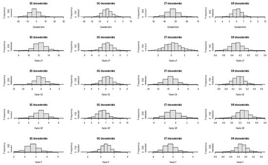 The saturated multivariate L9(34) OA dataset underwent a linear regression treatment to approximate the strength of its modelled parameters. The Gibbs sampling method was employed to retrieve the posterior conditional distributions for the four-response multi-parameter problem. The linear relationship between regressors and responses was assumed based on the preliminary visual evidence which was obtained from Figure 6. Therefore, the cause-and-effect relationship could be quantified by a simple linear regression modelling effort, since the regression coefficients could be estimated from the posterior conditional distributions. In Table 6, the mean coefficients of the four controlling factors are tabulated along with their respective model intercepts for each of the four process/product characteristics. The complete multivariate landscape of the sampled posteriors, expressed as a collection of conditional distributions, was established and used to estimate the regression coefficients (Figure 9).