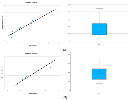 Q-Q plot and boxplot comparisons of the total observations for the four process/product characteristic responses: (A) energy consumption (EC), (B) gas consumption (GC), (C) cutting time (CT), and (D) surface roughness (SR).