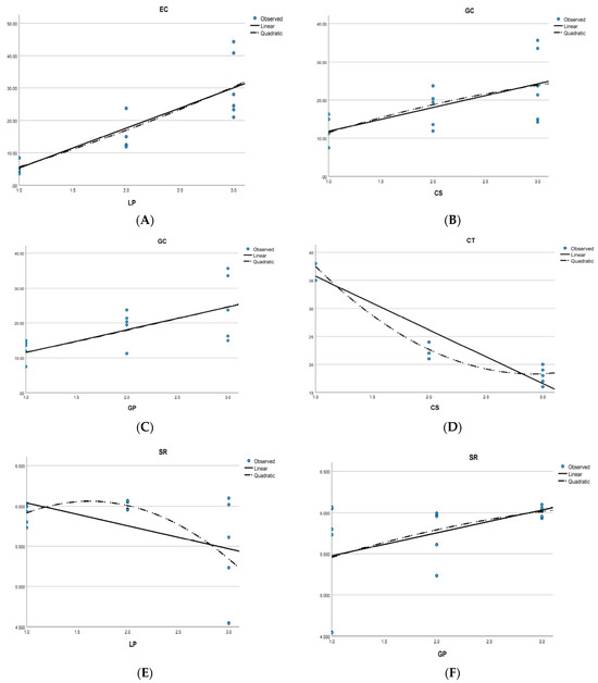 Linear and quadratic curve fitting for: (A) EC vs. LP, (B) GC vs. CS, (C) GC vs. GP, (D) CT vs. CS (E) SR vs. LP, (F) SR vs. GP.