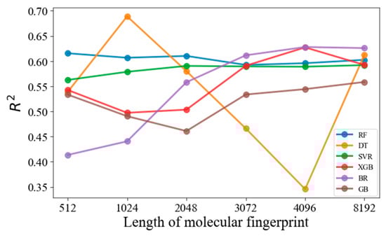 In this study, MFs are essential for converting molecular structures into fixed-length binary vectors, thereby enabling the quantitative assessment of molecular similarities and differences. This feature is vital for accurately and efficiently modeling molecular properties. To determine the optimal MF length that balances predictive performance with computational efficiency in the Morgan type, a preliminary study was undertaken. The R2 of the test set was selected to evaluate the predicting performances; Figure 1 illustrates how the R2 values were influenced by varying the length of MFs across different models. It was observed that longer MF lengths typically yield improved predictive performance for the tested models, except for the DT model. The variability in the performance of the DT model can be indicative of overfitting when provided with an increasingly complex feature space, a known limitation of decision trees. The selection of the optimal MF length was thus guided by a balance between maximizing predictive accuracy and maintaining computational efficiency. After evaluating the performance across various lengths, a 3072-bit length was chosen as the optimal size. This decision was based on its robust performance in enhancing R2 values across models, without disproportionately increasing computational demands. While lengths beyond 3072 bits did show some incremental improvements in R2, these were marginal and did not justify the significantly higher computational costs involved. Hence, 3072 bits was established as the optimal length for MFs in our study.