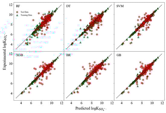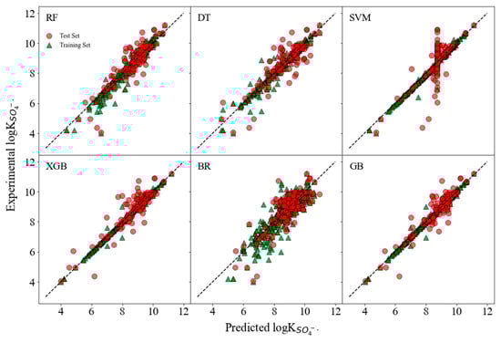 Six machine learning algorithms—random forest (RF), decision tree (DT), support vector machines (SVM), XGBoost (XGB), Bayesian ridge regression (BR), and gradient boosting (GB)—were utilized for predicting the reaction rate constant in the interactions between sulfate radicals and organic chemicals. These were selected for their diverse strengths and proven capabilities in various predictive modeling scenarios, ranging from capturing non-linear relationships to handling high-dimensional data. These predictive models were developed using scikit-learn packages []. Datasets were randomly split into an 80% training set and a 20% test set. Both internal and external validations were implemented to ascertain the reliability and robustness of the ML models, as well as their predictive capacity. Performance indices—correlation coefficient (R2), root-mean-square deviation (RMSE), and mean absolute error (MAE)—were computed. The concurrent application of these metrics in both training and testing phases facilitated a comprehensive evaluation. Specifically, RMSE underscored the model’s sensitivity to substantial errors, and MAE offered a direct estimation of average errors []. This dual approach steered the models towards a more balanced and resilient optimization.