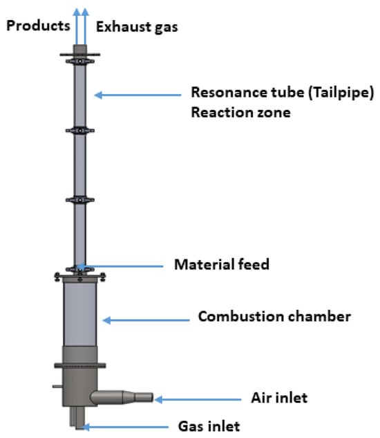 A typical laboratory pulsation reactor, as displayed in Figure 1, is an apparatus in which a mixture of air and natural gas is repeatedly ignited in the combustion chamber. This affects the hot gas pressure wave that develops in the adjacent tailpipe (TP); for this reason, it is occasionally referred to as the resonance tube. At the beginning of the TP, material for treatment will be injected into the pulsating hot gas stream and separated from the stream at the end of the TP. The particular process conditions in the TP allow for a variety of continuous material treatment applications, e.g., drying, calcination, and annealing [2,3]. However, PRs are primarily recognized for the possibility of synthesizing ultra-fine powdery products with advantageous properties at an industrial scale [4,5,6]. For example, Heidinger et al. [7] describe the synthesis of zirconia and silica nanoparticles in the PR.