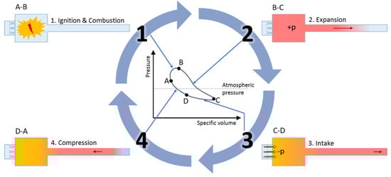 - Intake (C→D): When the combustion chamber drops below the ambient value, the fresh mixture is sucked in.