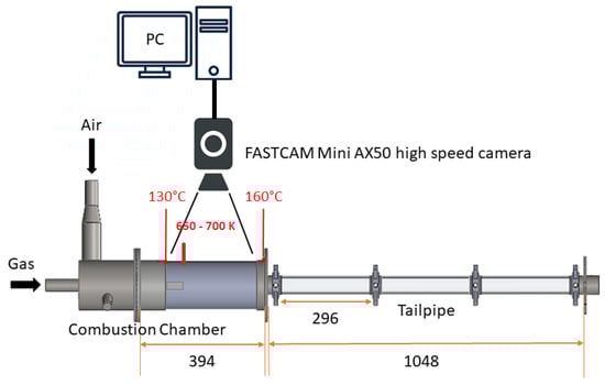 The experimental pulsation reactor setup, with a high-speed camera to capture the combustion chamber. All dimensions are introduced in mm. The actual orientation is vertical. The temperature of the combustion chamber steel wall is 100 °C to 200 °C, and the temperature of the combustion chamber glass wall around the gas inlet is 650 K to 700 K, as measured by an infrared thermal camera.