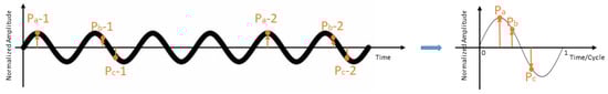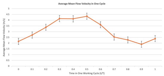 The synchronization of the camera shutter with periodic motion facilitates the acquisition of image pairs at distinct phase points. Subsequently, during image processing, the image pairs are gathered at the same phase point within each cycle ( and , and , and and in Figure 6; ultimately, there are enough phases to describe the flow velocity change within a working cycle. This process enables the precise determination of the velocity and direction of the tracing particles. Particle velocity is obtained by measuring the displacement of the particle, which occurs over a time interval (10 s). This calculation involves the utilization of DynamicStudio software (Dantec Dynamics, Denmark) to compute a cross-correlation in the sampling frequency space. The position of each phase in the cycle is determined by the delay time, which is the time of the measuring point from the trigger point.