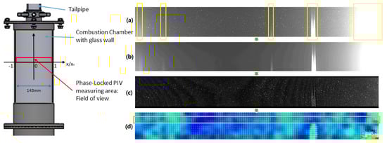 The phase-locked PIV measurement area is the field of view of the camera (Figure 7). In order to reduce the impact of the reflection of the measured glass pipe on the PIV results, the first consideration is adding appropriate filters to the camera before the experiment, including adding a green light filter to the camera lens, meaning only green light can pass through the filter and be captured by the camera. On the other hand, a polarization filter is added to reduce reflection. Reflection can also be reduced to a certain extent by adjusting the incident angle of the laser sheet during the experiment. In this experiment, the incident angle was adjusted to degrees to the greatest extent to reduce light reflection, and the deviation was within . In the image post-processing, the method of calculating the mean gray value of the image is adopted. As shown in Figure 7, there are reflections of different intensities in the yellow box areas in the original image Figure 7a. The calculated mean gray value pair of 1000 image pairs is displayed in Figure 7b. Subsequently, the mean image pair was subtracted from the gray value of the selected image pair for cross-correlation calculation to obtain the image in Figure 7c. Finally, the particle velocity vectors of selected image pairs was calculated, as seen in Figure 7d.