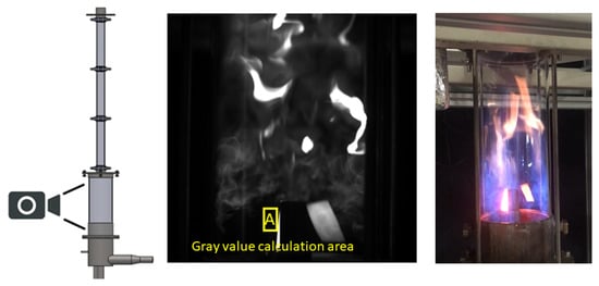 Combustion, especially the mechanisms of the re-ignition process, was investigated via flame observations in the combustion chamber. Thus, it is necessary to conduct comprehensive and complete time-resolved imaging to monitor the flame in order to fully understand its behavior. For such a purpose, a high-speed camera FASTCAM Mini AX50 (Photron, San Diego, CA, USA) [41] with a frame rate of 2000 fps with a resolution of 1024 × 1024 pixels was used (Figure 4). The predominant chemical constituents of both gas and air present in this PR include nitrogen (), oxygen (), carbon dioxide (), carbon monoxide (CO), and hydrocarbon molecules, such as methane () and ethylene (H4), as well as water vapor (O). Thus, numerous self-excited species are produced through chemical reactions within the flame, such as (513 nm to 516.5 nm), (430 nm to 431.5 nm), (340 nm to 650 nm), and (306.5 nm to 310 nm) [35,37,42,43]. The majority of the self-exciting species present in the combustion chamber exhibit photon emission, falling within the range of detectability by camera sensors, thereby establishing flame imaging as a feasible technique for the observation and analysis of flame dynamics. Consequently, the imaging technique utilizing the camera sensor enables a comprehensive study of flame luminosity and propagation, with the wavelength range for the camera sensor’s detection specified as 400 nm to 700 nm. The grayscale value within the 0–255 range is able to serve as an indicator for the luminosity of a grayscale image [44]. The illuminance can be used to draw conclusions about chemical combustion reactions, which also allows for statements to be made about energy efficiency. However, the illuminance cannot be measured directly with the camera used, but according to the manufacturer’s specification, the relationship between the gray value and illuminance is linear over the entire measuring range. Thus, quantitative evaluations are possible due to this proportionality.