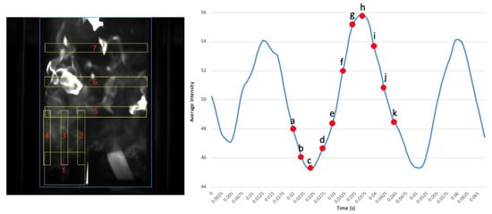 Since it is difficult to directly observe the approximate area and local distribution of the flame in the pseudo-color image (Figure 9), the temporal variations in flame intensity were delineated by selecting seven specific areas (Area1 to Area7 in Figure 9a). The intensities in different areas are shown in Figure 11 and Figure 12).