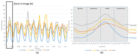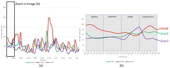 The flame spreads upwards from the moment of ignition and then expands across the entire combustion chamber until it fills the bottom of the combustion chamber (Figure 11), finally moving to the tailpipe (from Area5 to Area6, then from Area6 to Area7) until a cycle of combustion is basically completed (Figure 12). Figure 12a does not show obvious periodicity. This is given by the fact that the pressure and temperature distribution in different areas of the combustion chamber are different in each cycle, and the flame position and luminosity will not be completely repeatable. In the Intake stage, Area7 (the area close to the tailpipe inlet) shows an obvious increase in flame intensity, which may caused by the fluid inertia from the Expansion to the Intake stage.