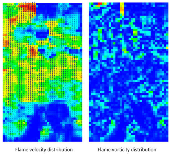 In order to describe the flame propagation process in detail and to detect turbulence, this study uses the calculation method of cross-correlation to carry out image processing of the flame. For each time point from a to k in Figure 10, the displacement of the flame is calculated by two consecutive frames. The intensity of turbulence can be expressed using vorticity calculations.