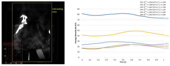 Upon comparing the grayscale values of the flame images acquired at OP1, OP2, and OP3 for identical values at 2.08, it was determined that alterations in did not result in substantial changes in flame luminosity, or the change is not obvious. As is visible in Figure 15, OP4 and OP5 represent values equivalent to OP3, with different values of , decreasing from OP3 to OP5. Pseudo-color images of the flame cycles for OP4 and OP5 are also presented in Figure 16.