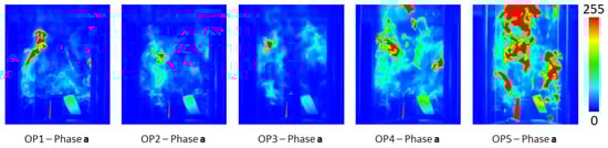 Flames visualization of different operation points from OP1 to OP5 at “Phase a” of a working cycle (RGB bar from intensity 0 to 255).