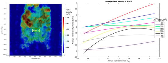 Average flame velocity inside a specific area with different air−fuel equivalence ratios and power density input (fitted curves for different working conditions).