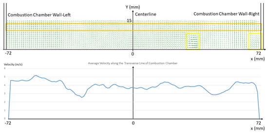 Since the velocity field distribution in the combustion chamber is very complex, it is not only related to the operating conditions of the combustion reaction gas and air flow rate but also to the shape (and volume) of the combustion chamber. Therefore, in order to investigate the velocity that the fluid flow may reach in the main combustion reaction zone (outer zone of complete combustion and middle zone of partial combustion), this experiment described the velocity field in the center of the combustion chamber under operating conditions (OP4, 35 × 21 ; 2D imaging; Figure 7), which is the typical stable pulse combustion for lean mixture conditions.