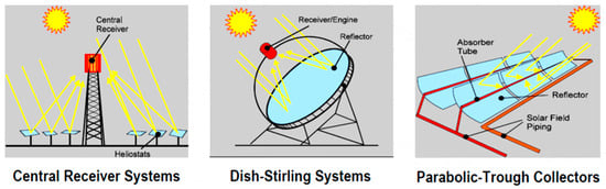 There are four main families of solar-concentrating technology, as shown in Figure 3—namely, parabolic trough collectors, parabolic dishes, linear Fresnel reflectors and solar towers. These are classified by the way they focus the Sun’s rays and the technology used to collect the Sun’s energy [7].