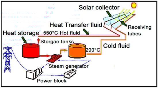 Given its chemical properties, the use of thermal oil as a heat transfer fluid (HTF) is environmentally dangerous, as it is inflammable and is not able to operate at temperatures above 400 °C. At higher temperatures, the components are subjected to degradation, and they cannot be used anymore; therefore, the efficiency of the overall steam is reduced. Moreover, due to the aging process, diathermic oil must be replaced every year (even if it is only used at a small amount), and this leads to further costs. Also, CSP plants using thermal oil as the HTF can only operate in the daytime [8].