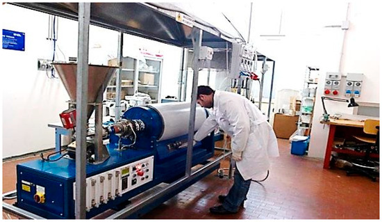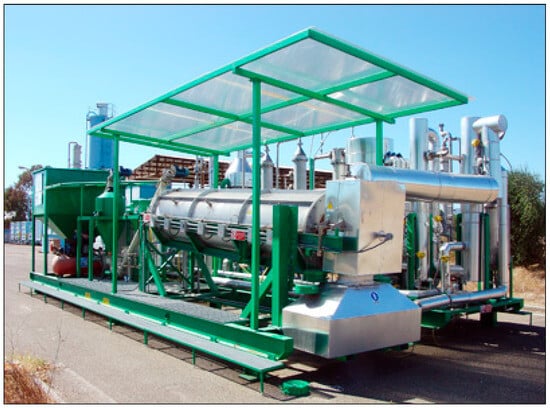 Also, a rotary kiln plant, with a treatment capacity of 30 kg/h, was built with an industrial partner SICAV srl (see Figure 14). This comprised a 4 m-long rotating drum reactor with an internal diameter of 0.4 m. The main purpose of this plant was to develop and optimize a thermo-chemical process to convert waste/biomass into solid products containing high-added-value “activated carbon” and synthesis gas.