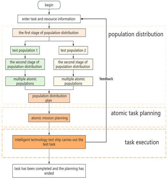According to the requirements of test task planning for intelligent technology test ships, the planning method is divided into an input layer, a population distribution layer, an atomic task planning layer, and a task execution layer.
