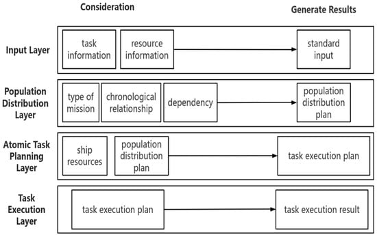 The input layer mainly manages and preprocesses task and resource information into a standard form that can be read by the next layer. Task information includes the types, numbers, and logical relationships of tasks. Resource information includes the energy and space resources of the intelligent technology test ship. The population distribution layer forms a population distribution plan based on task types, timing relationships, and dependency relationships. The atomic task planning layer generates the final task planning scheme by accepting the population distribution plan and planning using the group genetic algorithm. The task execution layer executes the test task according to the planning scheme and feeds back the execution process and the remaining resources of the ship to the input layer for re-planning the task in case of special circumstances.