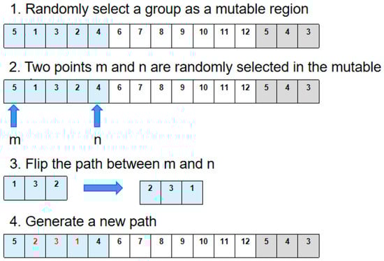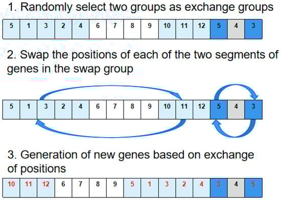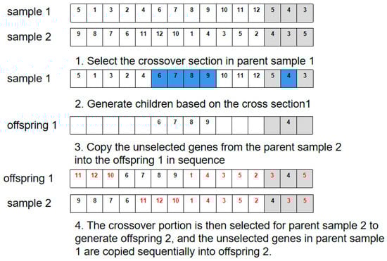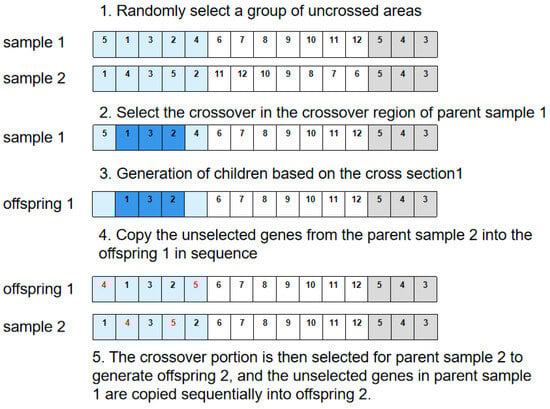 To improve chromosome diversity and speed up the convergence of the algorithm, a cross-domain path crossover operator was designed. The exchange process of the cross-domain path crossover operator is shown in Figure 6. It is implemented as follows: