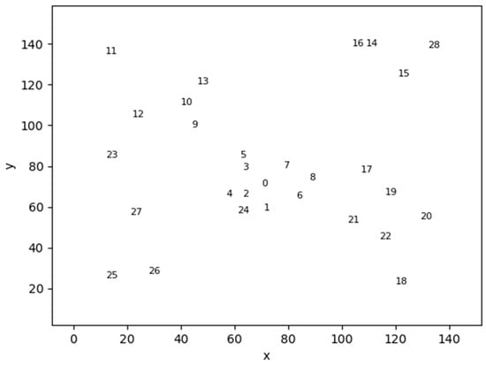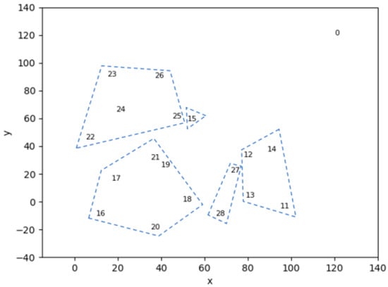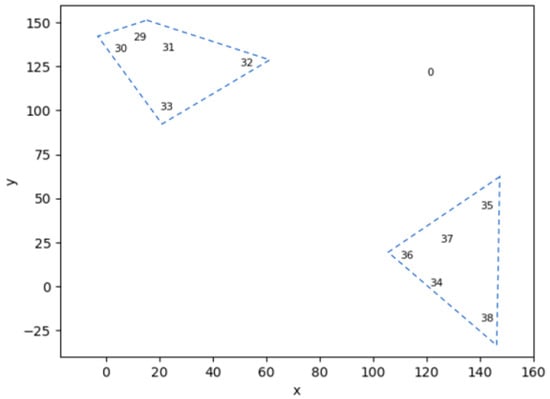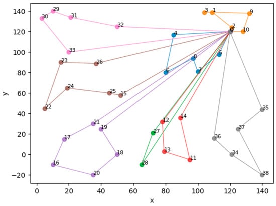 A task scale was added to Case 1 to test the stability of the task planning method. The new task scenario adds 10 new tasks and randomly changes the location of the test sea area as well as the task limitations; the new task assumes that the intelligent technology test vessel is required to test 38 test tasks in different sea areas, of which 10 tasks are urgent and need to be prioritized for testing, another 18 tasks are allocated more time and can be tested normally, and the last 10 tasks are the least urgent and are placed at the end of the test. The location distribution of the dock and each sea test area is shown in Figure 15, with point 0 indicating the location of the dock, and points 1–38 indicating the 38 sea test areas that need to be reached.